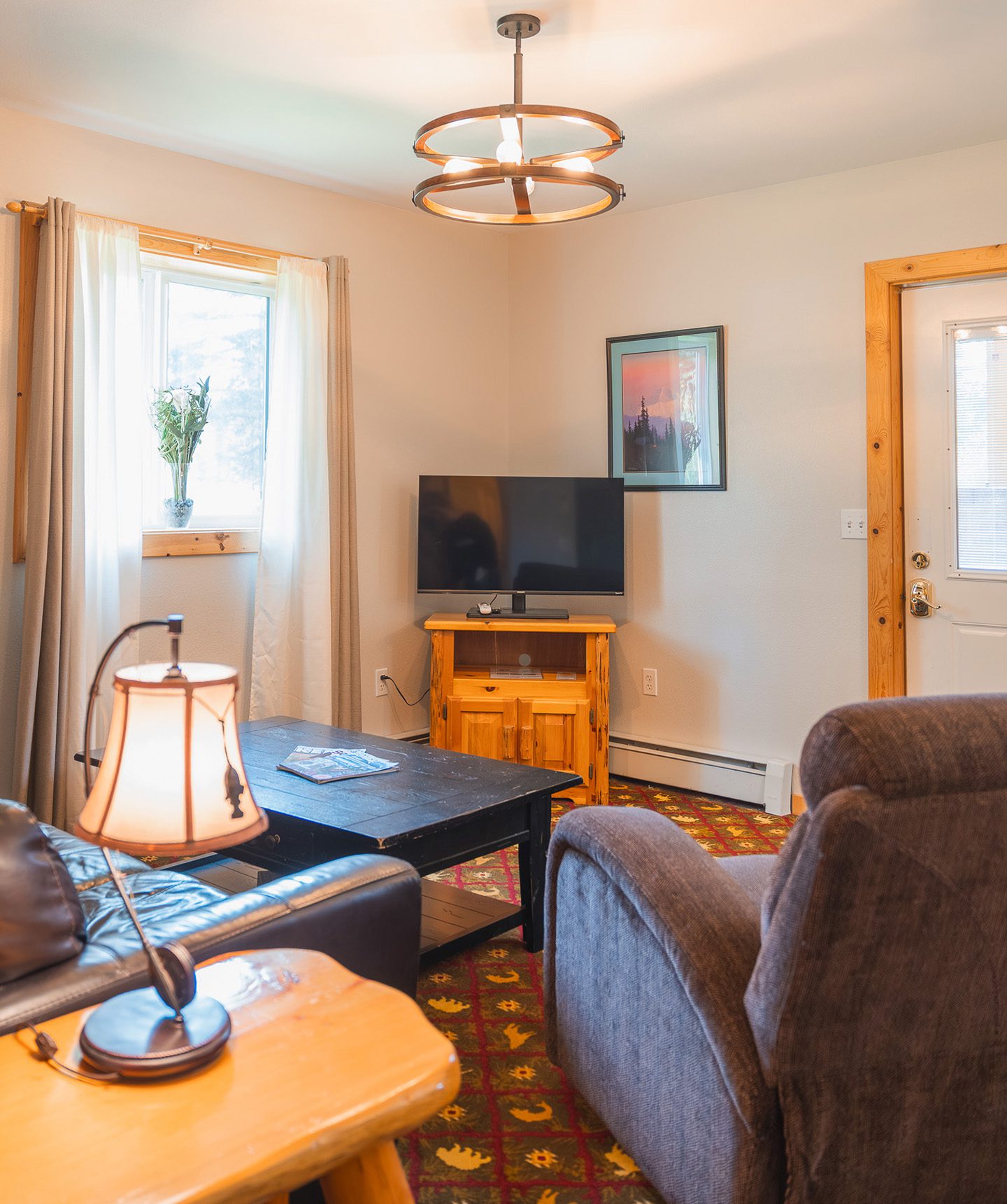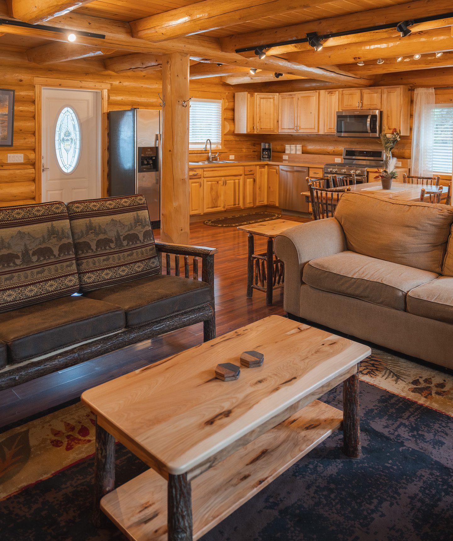Relax in luxury accommodations with fully equipped kitchens, comfortable living spaces, saunas, hot tubs, fitness facilities, and community fire pits under the Alaskan sky.